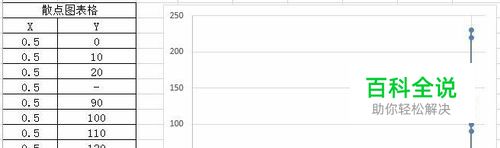 创建散点图:源数据调整后建立的新柱状图的轴坐标随之变化,而且轴坐标的值无法手动修改,因此需自行创建。根据上一步的新值创建数据表格,数据尽量选用整数,截断部分数据用“-”代替。 然后选择创建的表格,点击“插入>图表>散点图>带直线和数据标记的散点图”,插入散点图。插入后的散点图经常不符合要求,因此要进行以下操作:“点击散点图>右键-选择数据>编辑>系列名称-选Y>X轴系列值(x)-选X对应列>Y轴系列值(Y)-选Y对应数据列>确定>确定”,得到符合要求的散点图。数据及散点图如下图: