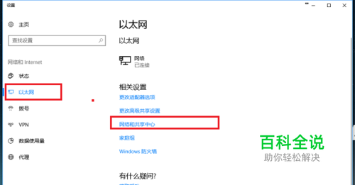 第二步进去网络和Internet之后,点击以太网,选择网络和共享中心,如下图所示: