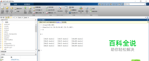 我们将其分成4行3列的小块矩阵, B=mat2cell(A,[10,20,30,40],[25,75,100]); 如下图
