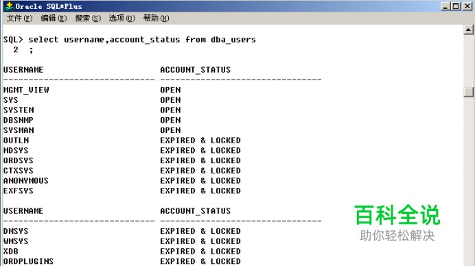 1、通过数据字典dba_users,查看Oracle账户的锁定状态,如下:(v其中,OPEN表示账户为解锁状态;EXPIRED表示账户为过期状态(需要设置口令才能解除此状态);LOCKED表示账户为锁定状态。)