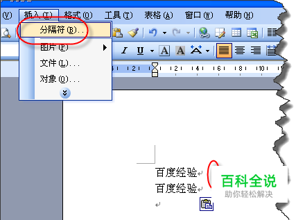当光标定位在第一段落结束位置,在“插入”菜单中点击“分隔符”命令。