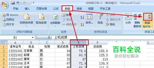 选中你要设定不能输入重复数据规则的那列数据,然后点击数据选项,接着在菜单栏上面点击数据有效性。