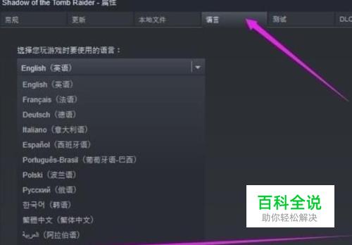 库中找到古墓丽影暗影,右键游戏选择属性,在语言一览当中找到并选择简体中文或者繁体中文,进入游戏后即为中文。