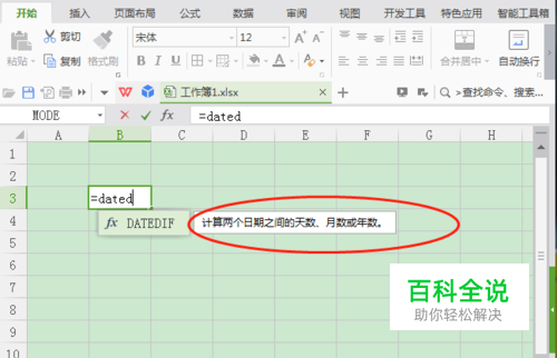 搜索函数DATEDIF,然后点击下面方框中的DATEDIF函数,点击确定(如图);