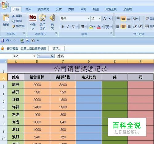 新建一张电子表格,在表格中添加以下列,姓名、销售目标、实际销售、完成比列、奖、罚,把姓名、销售目标、实际销售三列填充完毕,如图所示。