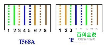 T568A标准连线顺序从左到右依次为:1-绿白、2-绿、3-橙白、4-蓝、5-蓝白、6-橙、7-棕白、8-棕。 T568B标准连线顺序从左到右依次为:1-橙白、2-橙、3-绿白、4-蓝、5-蓝白、6-绿、7-棕白、8-棕。