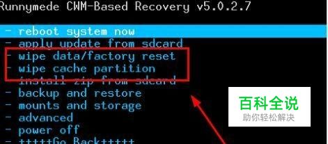 今入recovery 基本你就快成功了。 选择出现界面里的wipe开头的两个 进入 (不管是什么样的,内容都大同小异。选择就没错)