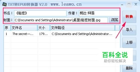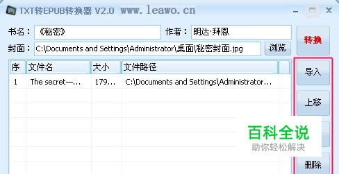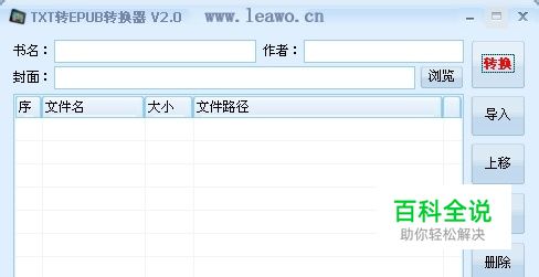 txt转epub格式转换器的界面非常简洁,界面的右侧是一组按钮,分别是转换、导入、上移、上移、删除、清空,这些按钮功能就是字面上的意思就不用一一细说了,提两点的是,一是添加txt文件进来除了用【导入】功能键外还可以直接将文件拖拽到界面框里一样能达到导入文件目的,而是上下移动就是当你批量转换txt文档的时候,它会默认转换成一个epub格式文件,可以在转换前通过上下移动的功能键来决定转换后epub格式文档集合里面那些txt文章的排列前后顺序。