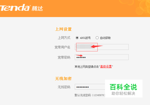 首先在浏览器网址栏输入192.168.0.1,打开腾达路由器设置界面。输入自己的宽带账号,密码。