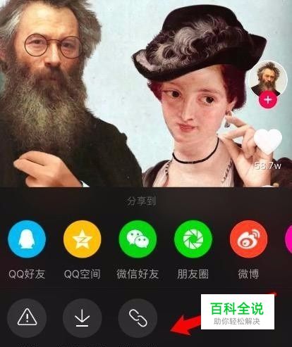 1、打开抖音,进入你想下载的视频页面,点击页面上的分享按钮,再弹出的菜单中选择“复制链接”,如图: