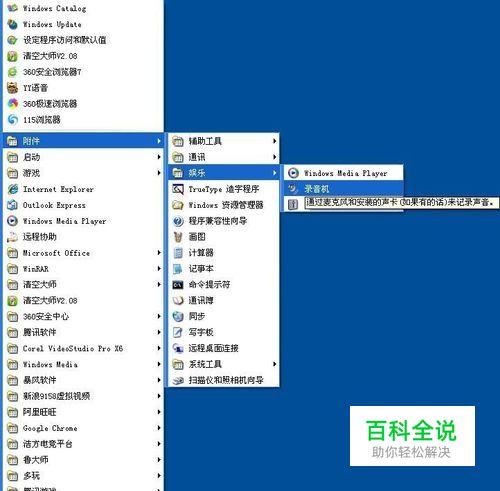点击电脑桌面左下角的开始→所有程序→附件→录音机。