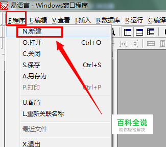 运行“易语言”编程环境,在程序主界面中点击“程序”->“新建”按钮。