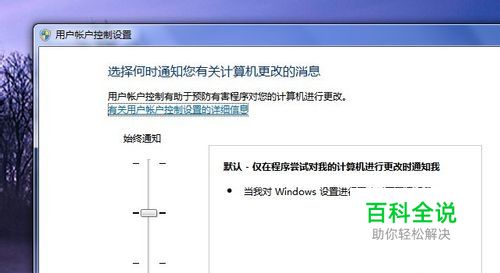 打开下一面板后,只需将滑块移至第一个刻度下的刻度即可减少用户帐户的通知。建议移至第二个刻度,在保证安全的同时,也避免了打扰。设置完毕后,点击“确定”按钮,如图所示。