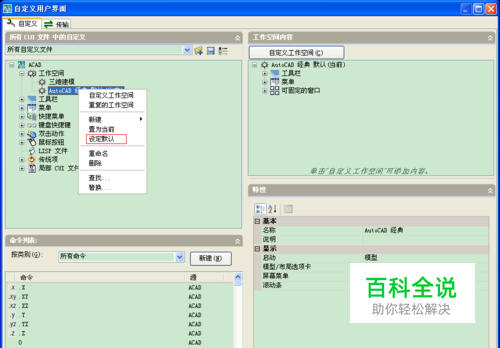首先输入命令:【CUI 】之后在--自定义--工作空间--右键点击“AutoCAD经典”选择设定默认。