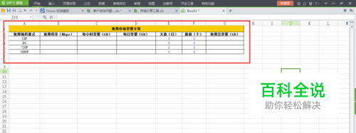 在打开的Excel表格上编辑视频容量存储计算的表格。横坐标包括视频编码模式,视频码流,每小时容量,每日容量,天数,路数,每日视频总容量等信息。竖坐标采用了CIF,D1,720P、1080P四种编码模式。