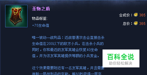 出门装首选 圣物之盾,它可以让作为坦克的你赖线能力无比强大,既保证金钱收入,又保证血量回升,是布隆出门必备利器。剩下的钱可以带两瓶红和一瓶蓝,在加个免费的监视图腾。