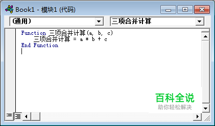 在打开的模块窗口中,输入以下代码: Function 三项合并计算(a, b, c) 三项合并计算 = a * b + c End Function 该代码用于对提供的三个参数进行计算,结果返回函数本身。
