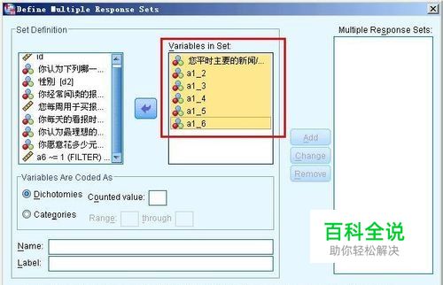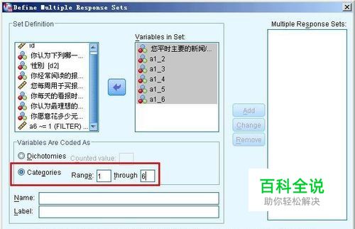 选择变量是如何编码的,我们刚才看到了,每个变量都有6个选项,这就是分类变量了,所以要选择category。如果每个选项变量是是否形式的,应该选择dichotomies。