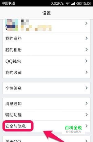 首先,我们打开手机QQ,点击 设置——》安全域隐私,如图。