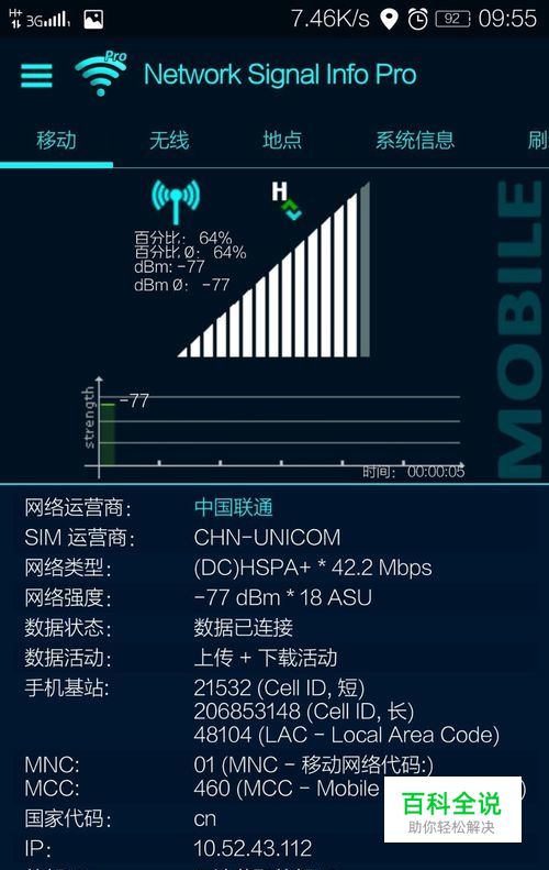 然后关闭这个软件,打开 基站信号检测软件,打开手机 GPS功能。如下图1。你会发现这个软件显示的基站码和小区码是和你刚才测试所得到的是一样的。 注意这里,一定要打开手机GPS功能,来给你得手机定位。而且要多等一会,注意观察图2红色框搜星24颗校准0颗,因为我是随便打开就截图的,所以没有等校准。 但是实测的时候一定要等校准的越多,最终基站定位的方向约准确。8颗以上就可以了。 校准成功以后,点击 数据一栏,出现图4。 你安装的什么放大器就选那一项查询。电信的就选电信的,移动联通的就选移动联通的。我用的联通的,所以选择移动联通,如图3。 输入刚刚笔记下的基站码和小区码,如图5,选择联通、联网(因为选本地是没有数据纯在的)、10进制。点击查询。 得到图6。白色框里有 经纬度。用笔记下该数据。
