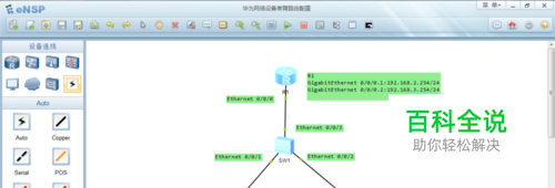 首先利用华为模拟器eNSP来设计逻辑网络拓朴图,有一台路由器AR1220,一台二层交换机S3700,二台PC主机。其之间用线缆连接并作好标注。