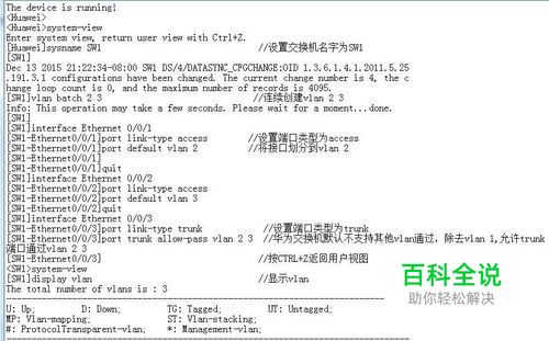 在华为模拟器eNSP中打开终端配置交换机S3700,配置内容截图如下 system-view sysname SW1 //设置交换机名字为SW1 vlan batch 2 3 //连续创建vlan 2 3 interface Ethernet 0/0/1 port link-type access //设置端口类型为access port default vlan 2 //将接口划分到vlan 2 quit interface Ethernet 0/0/2 port link-type access port default vlan 3 quit interface Ethernet 0/0/3 port link-type trunk //设置端口类型为trunk port trunk allow-pass vlan 2 3 //华为交换机默认不支持其他vlan通过,除去vlan 1,允许trunk端口通过vlan 2 3 [SW1-Ethernet0/0/3] //按CTRL+Z返回用户视图 system-view display vlan //显示vlan display interface brief //显示接口概 save