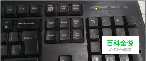 在键盘上找到Scroll Lock键,如下面,红色椭圆注明键,按下按键,小键盘右上面最右边指示灯熄灭(台式电脑),即可