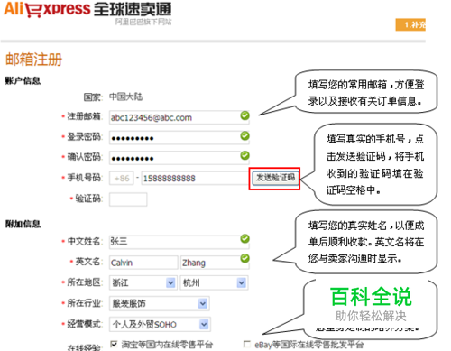 注册表单时注意事项: 一、填写准确的邮箱地址及手机号码。您在速卖通平台的订单等信息都将会以邮件的形式发送到您的注册用的邮箱,所以您在注册时务必填写常用且准确的邮箱地址。我们推荐您使用@alibaba.com或@yahoo.com.cn等专业邮箱服务器。请您填写真实有效的手机号,保证能收到验证码。 二、填写真实姓名。在注册时您务必保证您所填写的个人信息准确和真实,以便于您在成单以后可以顺利收款。 三、准确填写行业背景和经验信息。请您准确地填写行业、经验模式和在线经验信息,这样您将获得速卖通为您量身定制的培养方案,更加有利于您的成长。 第二步: 验证您的邮箱 填写注册表单后,您需要完成邮箱认证,以确保您的邮箱正确、有效。 一、在您填写好表单提交后,会弹出邮箱验证的页面。如果您确认无误,可以直接到邮箱里查收邮件,如果邮箱有误或者您没有收到邮件您可以按照提示的方法修改邮箱,如下图所示: