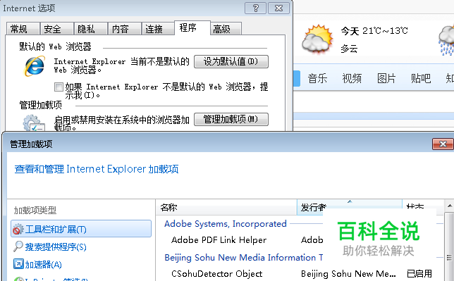将需要启用的插件进行还原,首先打开ie浏览器,然后点击工具栏上方的“工具-Internet选项”,切换到“程序”选项卡,点击“管理加载项”,将里