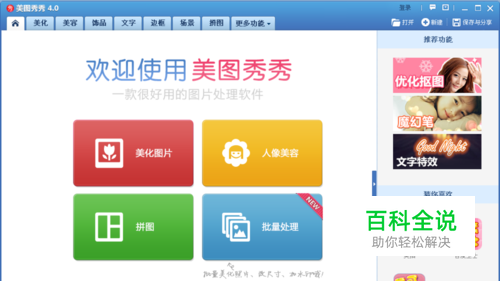 打开美图秀秀,选择美化图片或者右上角的打开,打开一张待处理的照片。
