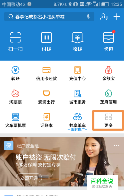 第一步:打开手机应用【支付宝】,进入支付宝界面(如图),点击【全部】