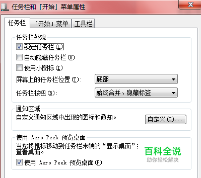 打开电脑,在底部的任务栏空白处点击鼠标右键,点击属性,打开任务栏和开始菜单对话框