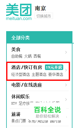 进入美团网站,在左侧分类中选择“ 酒店/快订有房”。