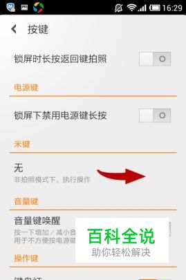 在按键页面,可以按到有包含菜单键,返回键,电源键,米健等的设置,下拉到米健列表框,选择“无”,进入快捷键设置。