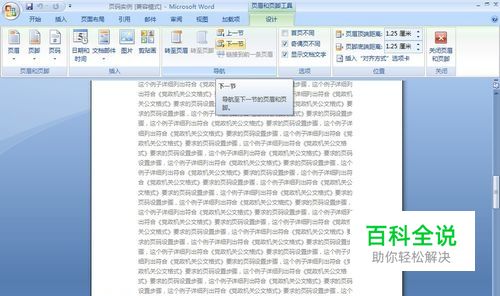 点击菜单栏“设计”下的“下一节”,进入偶数页页码编辑。参照步骤3、4设置好偶数页页码。注意,偶数页页码应当选择“页面底端”的第一个“普通数字1”,也不要动自动生成的“2”。完成后双击页面正文编辑区就OK了。