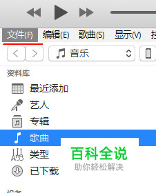 将手机连接电脑打开itunes,在菜单栏下方选择"音乐",点击"歌曲",再选择点左上角,"文件"--->"将文件添加到资料库"