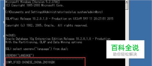 在cmd命令行下输入“sqlplus 用户名/密码@服务名”来登陆数据库,其中用户名,密码,服务名需要根据实际情况进行替换。登陆完成后,会发现提示语并不是中午,或者包含有乱码,这就是我们需要解决的问题。在sqlplus中执行 select userenv('language') from dual;查看当前数据库的字符集,为:SIMPLIFIED CHINESE_CHINA.ZHS16GBK。我们只需要把客户端字符集和操作系统字符集都设置成这个就行了