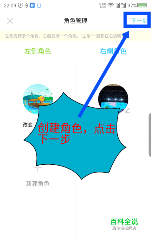 点击铅笔图标后,打开创建小说的角色管理界面,需要创建角色,上传头像和输入角色名字,点击右上角的下一步。如图所示