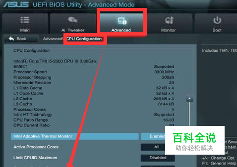 接着选择进入“Advanced”(高级)——>“CPU Configuration”(处理器设置)。