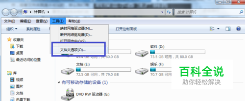 进入“我的电脑(计算机)”;在上面的菜单栏选择“工具”选项卡。