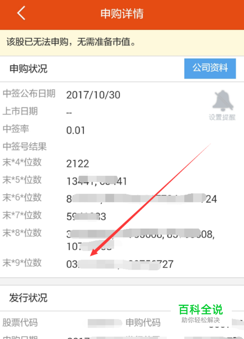 在查询界面上点击新股的申购价格可以跳转到申购详情界面,在这里可以看到中签号码,如下图所示。