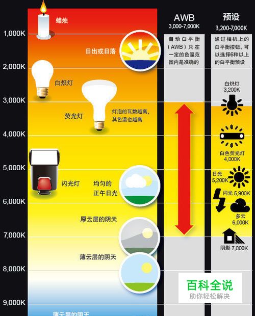 上一步中提到了色温的概念,相机的色温范围,决定于你所使用的白平衡设置。下表中左侧的数值单位是开尔文(Kelvin),日光标准色温值5400K,低温呈暖色,高温呈冷色。