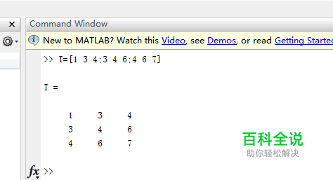 打开matlab,第一种方法是直接建立矩阵。例如在命令窗口中输入T=[1 3 4;3 4 6;4 6 7] 回车后生成了这个3阶矩阵