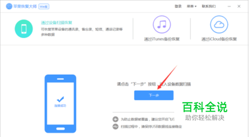 搜狗搜索软件官网,根据对应的版本下载软件。选择【通过设备扫描恢复】模式。这个模式的优点在于:即使之前没有用iTunes备份过手机数据,也可以通过这个模式来恢复我们被删除的数据。连接完成后,点击【下一步】按钮对手机数据进行扫描。