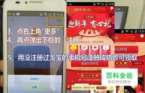 第五步: 点击,领取礼包,会自动跳转到登录页面,然后点 右上角“更多”--“注册” 1、输入要注册的手机号码和验证码 2、同意注册手机淘宝领取新年礼包