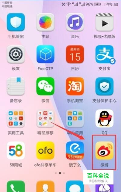 打开“微博”,找到如下图箭头指示的位置,点击打开;