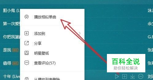 我们也可以在打开的QQ音乐播放列表 中,右键点击播放菜单,在弹出菜单中选择“播放相似单曲”菜单项。