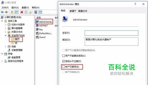 选择“本地用户和组”---“用户”,右侧栏“双击”Administrator, 在勾去“账户已禁用”---确定