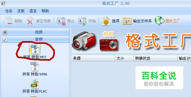 打开格式工厂,点击左边的“音频”,然后在下面点选“所有转换到MP3”。