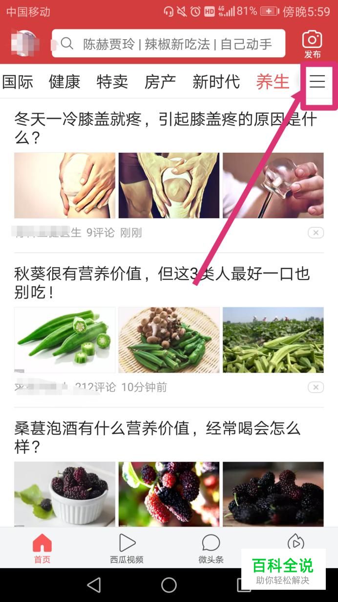 然后进去今日头条首页,在右上角有一个菜单符号,将其打开,如下图。
